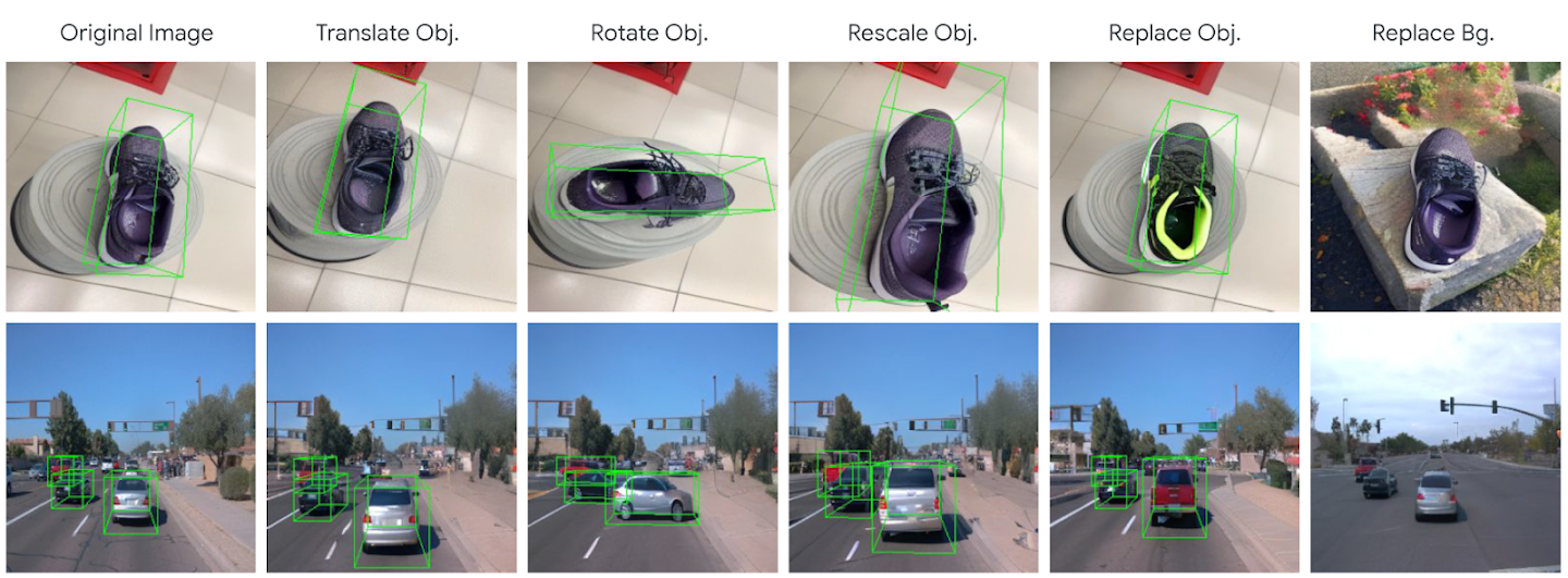 Given a source image and object 3D bounding boxes, we can translate, rotate, and rescale the object, or transfer objects or backgrounds between images