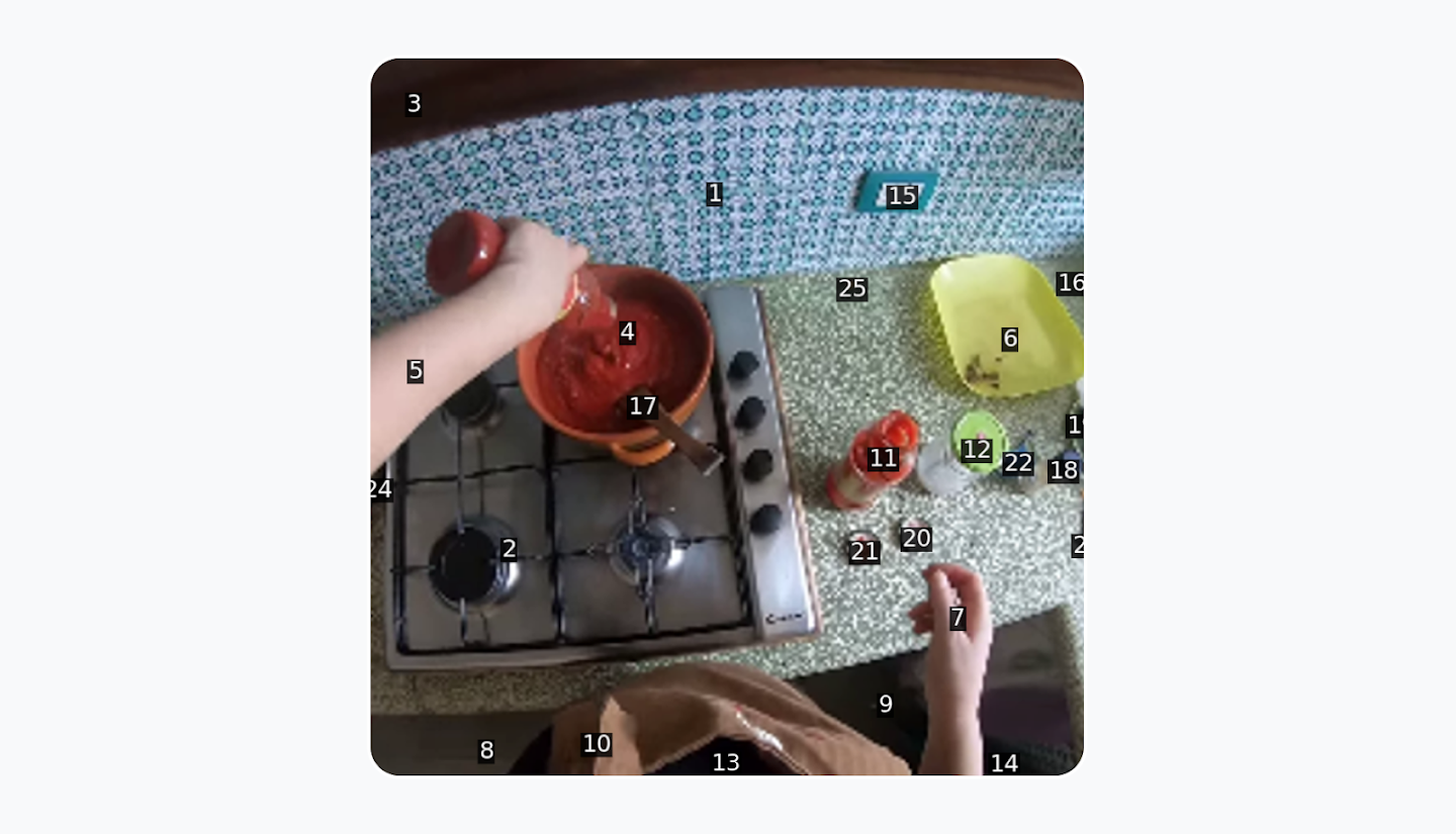 A frame from a video demonstration of someone making a sauce, with individual elements identified and numbered. ICAL is able to extract the important aspects of the process