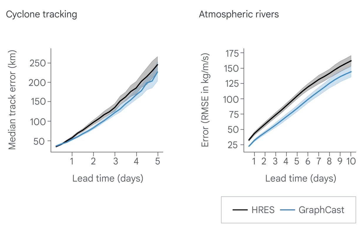 Right: Atmospheric river prediction. GraphCast’s prediction errors are markedly lower than HRES’s for the entirety of their 10-day predictions