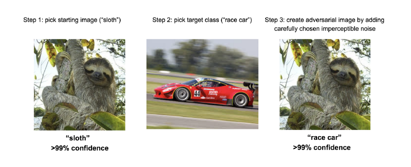 An adversarial input, overlaid on a typical image, can cause a classifier to miscategorise a sloth as a race car. The two images differ by at most 0.0078 in each pixel. The first one is classified as a three-toed sloth with >99% confidence. The second one is classified as a race car with >99% probability.