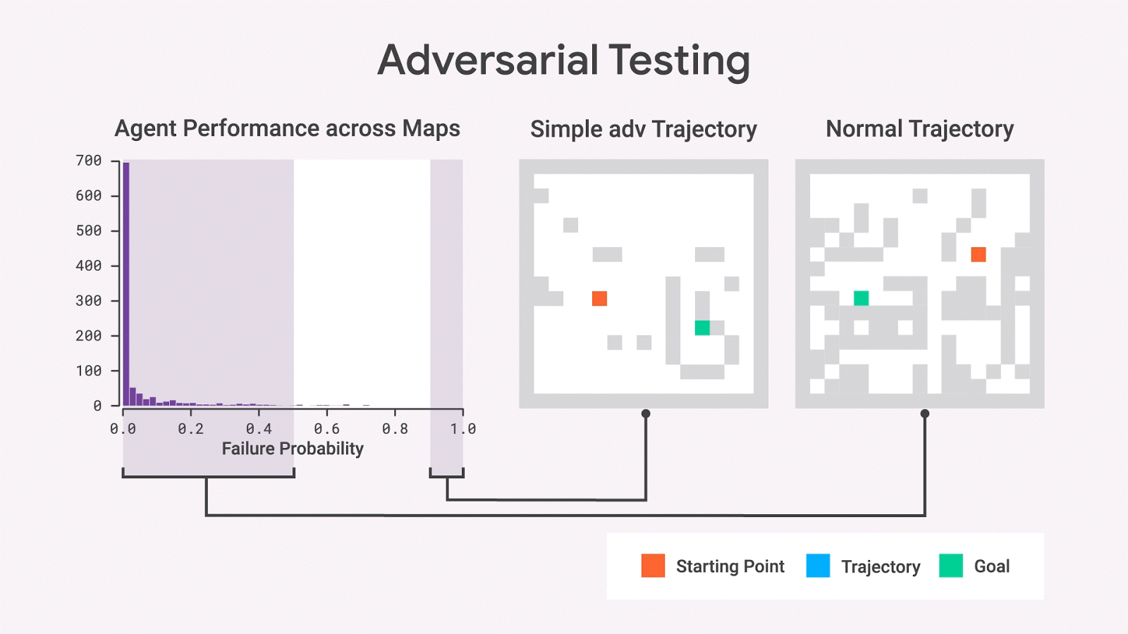 With random sampling, we almost never observe maps with high failure probabilities, but adversarial testing reveals such maps do exist. These maps retain high failure probabilities even after many walls are removed, yielding simpler maps than the original.