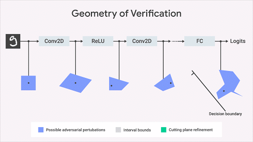 Rigorous testing and training can go a long way towards building robust machine learning systems. However, no amount of testing can formally guarantee that a system will behave as we want. In large-scale models, enumerating all possible outputs for a given set of inputs (for example, infinitesimal perturbations to an image) is intractable due to the astronomical number of choices for the input perturbation. However, as in the case of training, we can find more efficient approaches by setting geometric bounds on the set of outputs. Formal verification is a subject of ongoing research at DeepMind.