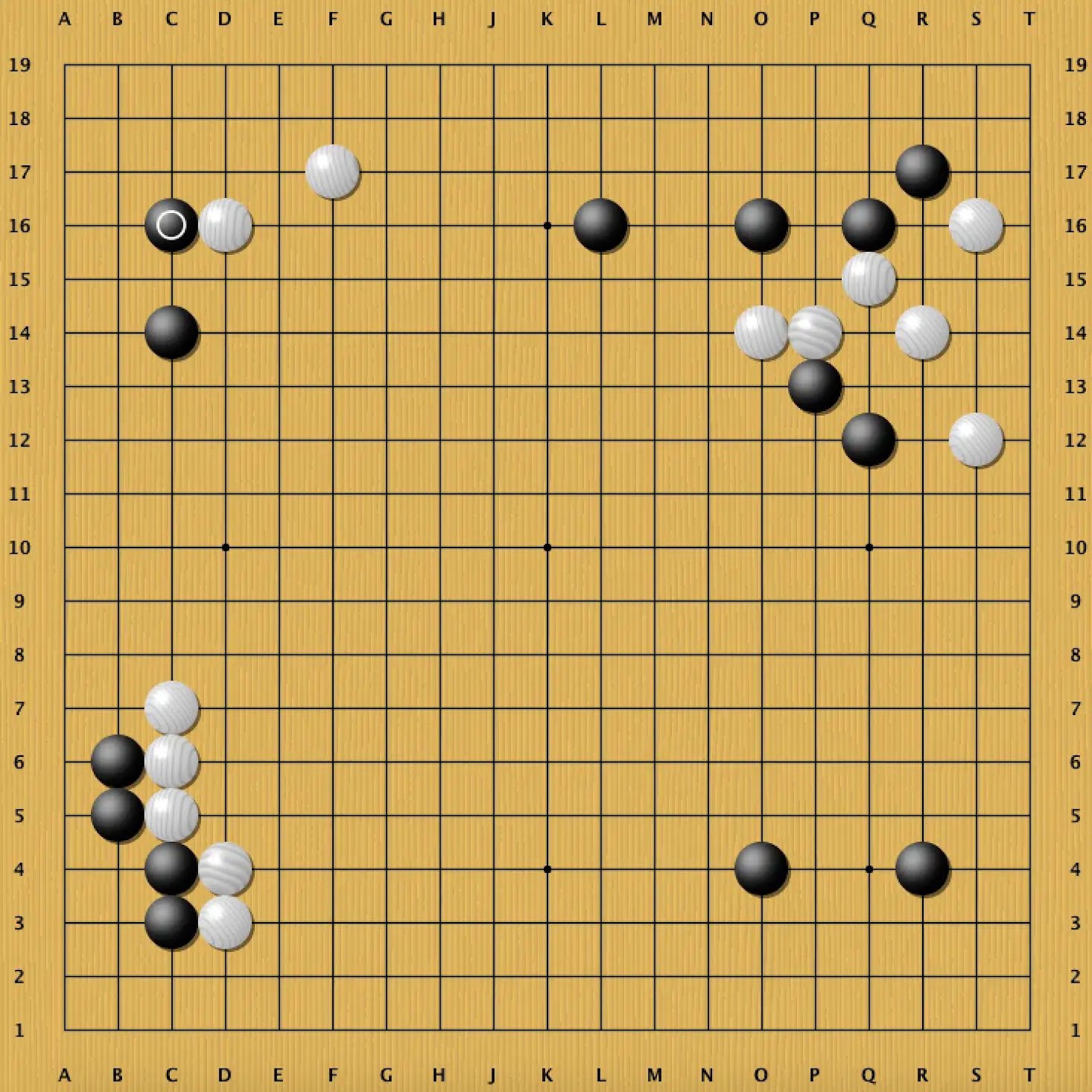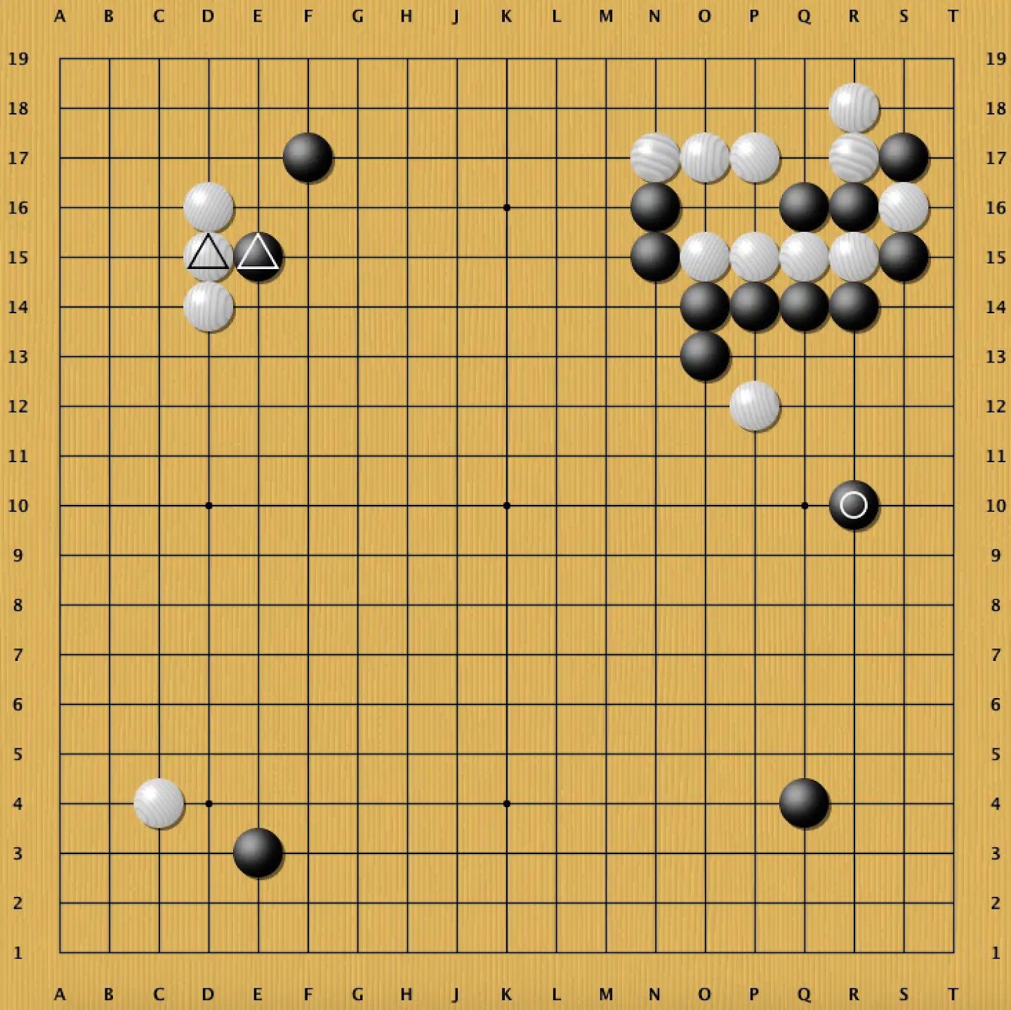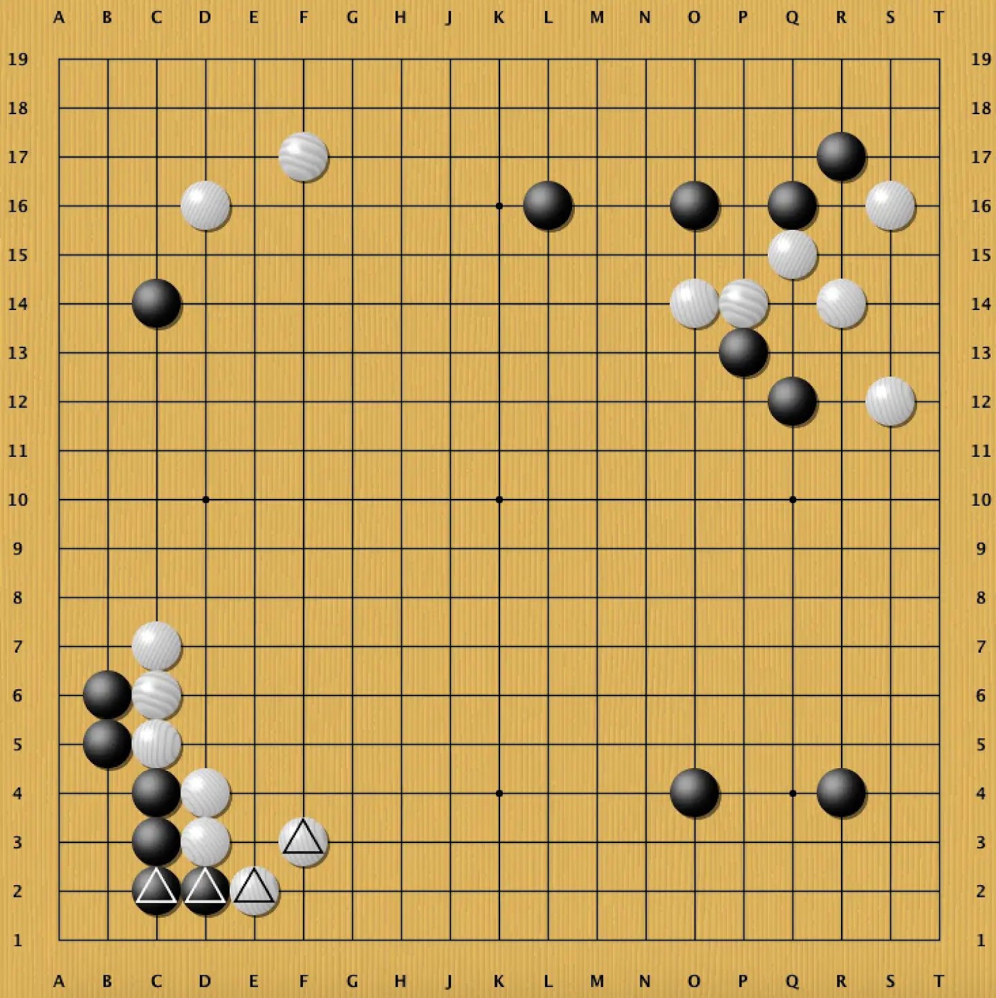 In this game (Dia. 1), Black (AlphaGo) has little secure territory, while White has three corners, but Black's influence radiates across the entire board. In particular, while the marked exchange solidifies White, it also improves Black's potential. Go players usually shy from such exchanges, which pay a definite price for uncertain profit, but AlphaGo combines its sterling judgment with a keen sense of risk and reward to make such moves possible.