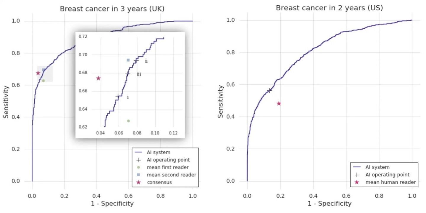 We compared the performance of the AI system against decisions made by individual human specialists in the original screening visit. In this evaluation, we found that the AI had an absolute reduction in false positives (women incorrectly referred for further investigation) of 5.7% for US subjects and 1.2% for UK subjects, and a reduction in false negatives (women incorrectly missed for further investigation) of 9.4% for US subjects and 2.7% for UK subjects, compared to human experts. See the paper for more extensive results.