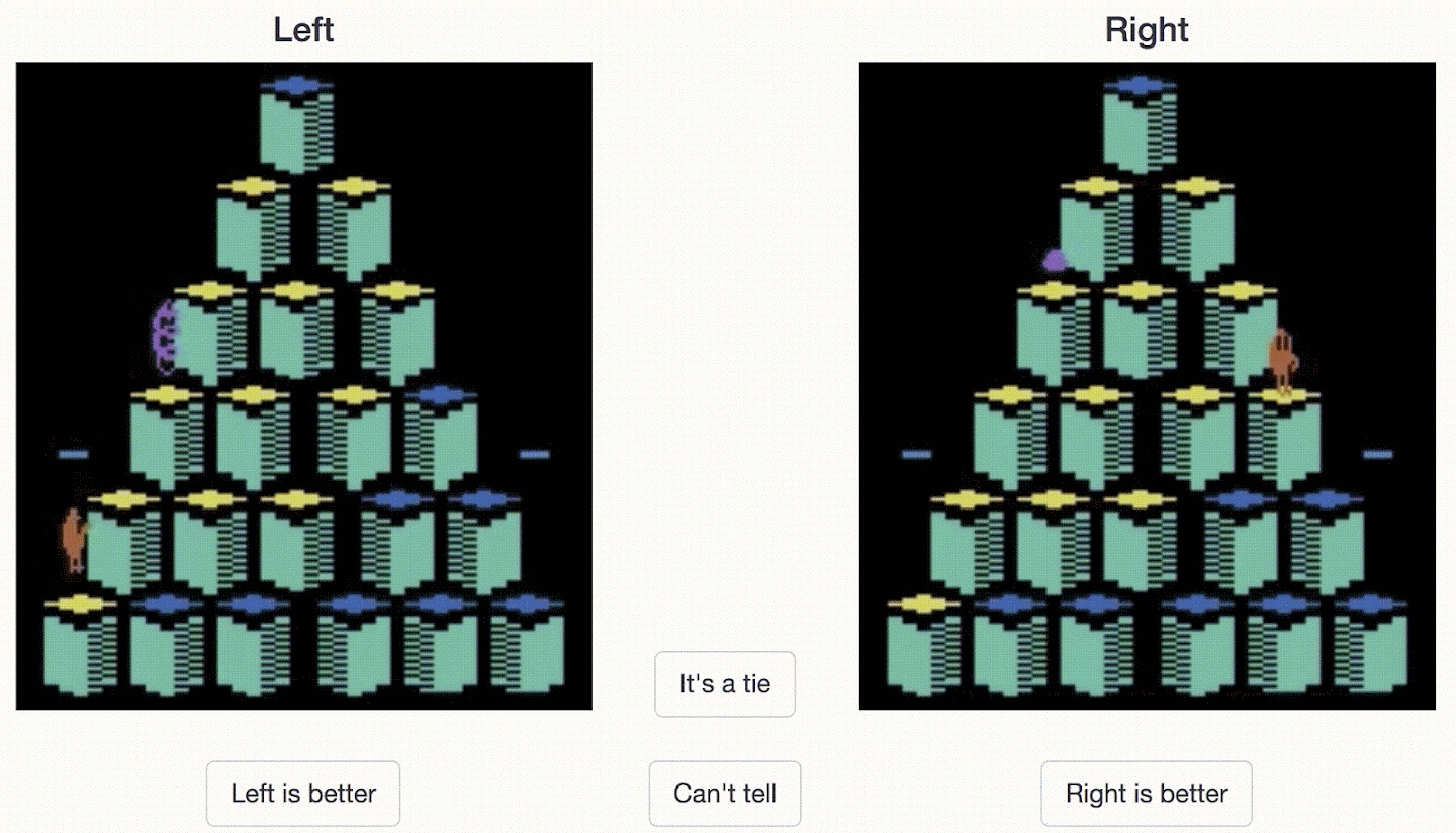 Human operators have to choose between two clips. In this example, for the Atari game Qbert, the right hand clip shows the better - point scoring - behaviour