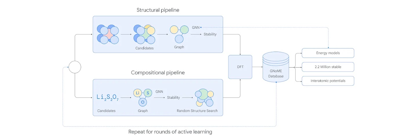 GNoME uses two pipelines to discover low-energy (stable) materials. The structural pipeline creates candidates with structures similar to known crystals, while the compositional pipeline follows a more randomized approach based on chemical formulas. The outputs of both pipelines are evaluated using established Density Functional Theory calculations and those results are added to the GNoME database, informing the next round of active learning.