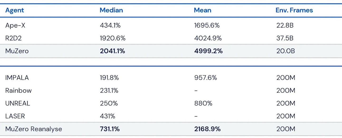 Performance on the Atari suite using either 200M or 20B frames per training run. MuZero achieves a new state of the art in both settings. All scores are normalised to the performance of human testers (100%), with the best results for each setting highlighted in bold.
