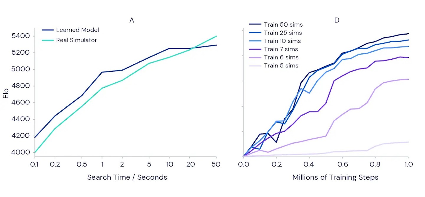 We also tested how well MuZero can plan with its learned model in more detail. We started with the classic precision planning challenge in Go, where a single move can mean the difference between winning and losing. To confirm the intuition that planning more should lead to better results, we measured how much stronger a fully trained version of MuZero can become when given more time to plan for each move (see left hand graph below). The results showed that playing strength increases by more than 1000 Elo (a measure of a player's relative skill) as we increase the time per move from one-tenth of a second to 50 seconds. This is similar to the difference between a strong amateur player and the strongest professional player.