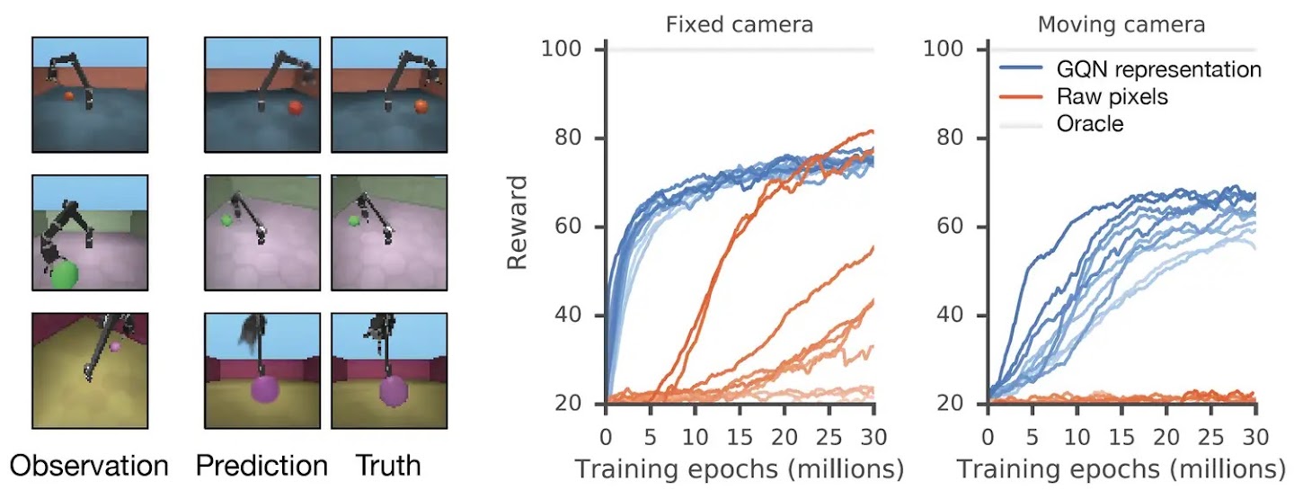 - The GQN’s representation allows for robust, data-efficient reinforcement learning. When given GQN’s compact representations, state-of-the-art deep reinforcement learning agents learn to complete tasks in a more data-efficient manner compared to model-free baseline agents, as shown in the figure below. To these agents, the information encoded in the generation network can be seen to be ‘innate’ knowledge of the environment:
