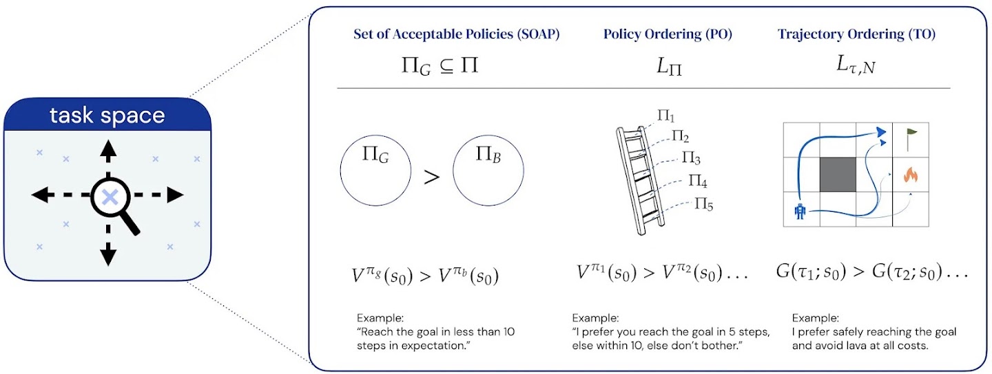 To make our study of this question concrete, we first restrict focus to three kinds of task. In particular, we introduce three task types that we believe capture sensible kinds of tasks: 1) A set of acceptable policies (SOAP), 2) A policy order (PO), and 3) A trajectory order (TO). These three forms of tasks represent concrete instances of the kinds of task we might want an agent to learn to solve.