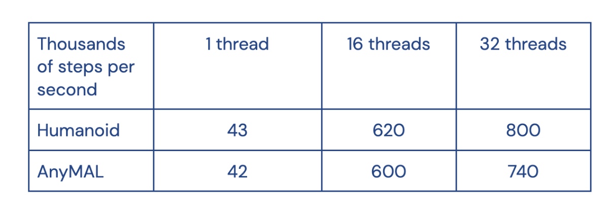 As a C library with no dynamic memory allocation, MuJoCo is very fast. Unfortunately, raw physics speed has historically been hindered by Python wrappers, which made batched, multi-threaded operations non-performant due to the presence of the Global Interpreter Lock (GIL) and non-compiled code. In our roadmap below, we address this issue going forward.