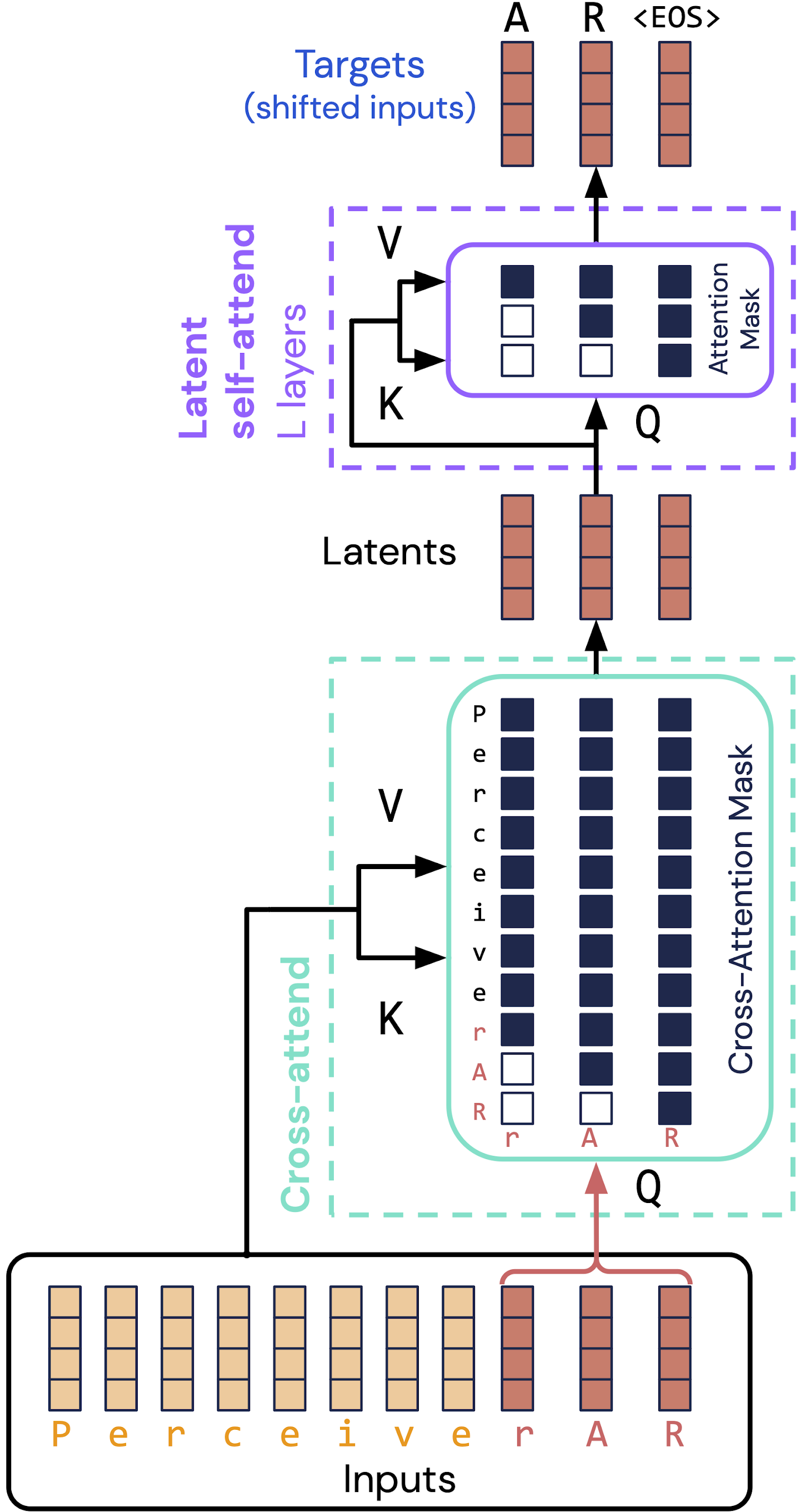 Perceiver AR maps an input sequence (P e r c e i v e r A R) to a small latent space by cross-attention to produce one latent for each target token (3 latents shown, one for the targets A R <EOS>, for End Of Sequence). These latents are then processed by a deep stack of self-attention layers. Perceiver AR can be trained for end-to-end autoregressive generation, all while making use of very long input sequences.