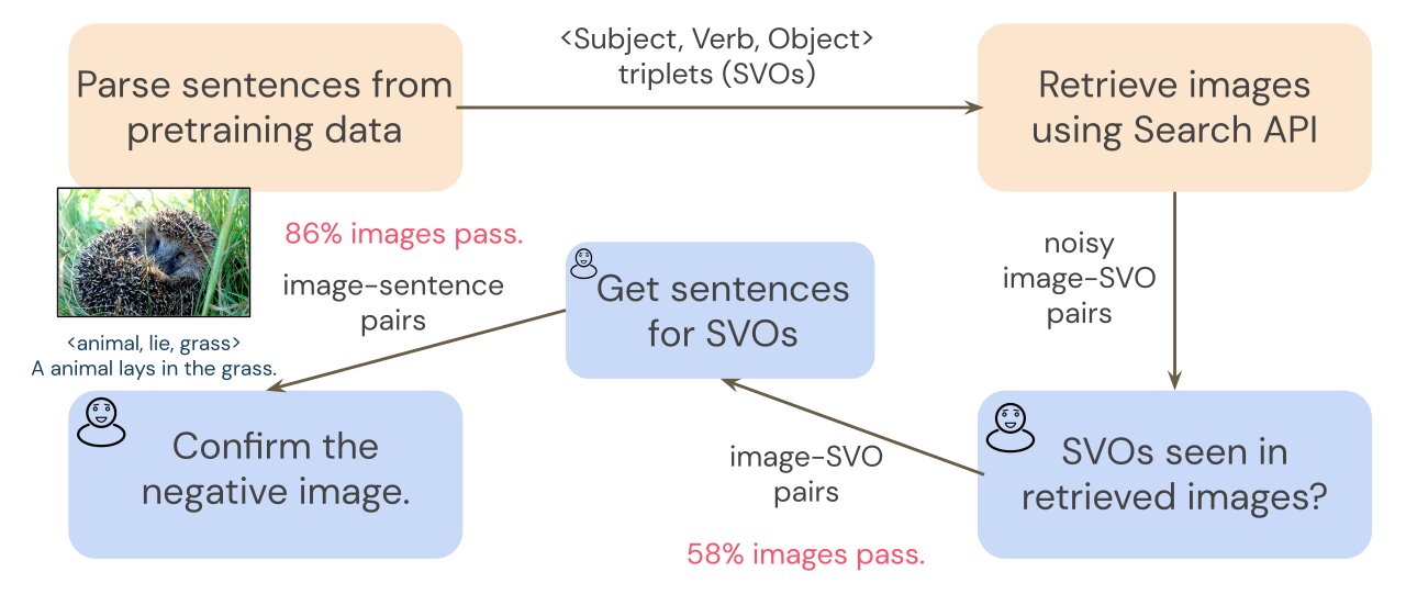 To create SVO-Probes, we query an image search with SVO triplets from a common training dataset, Conceptual Captions (Sharma et al. 2018). Because image search can be noisy, a preliminary annotation step filters the retrieved images to ensure we have a clean set of image-SVO pairs. Since transformers are trained on image-sentence pairs, not image-SVO pairs, we need image-sentence pairs to probe our model. To collect sentences which describe each image, annotators write a short sentence for each image that includes the SVO triplet. For example, given the SVO triplet <animal, lie, grass>, an annotator could write the sentence “An animal lays in the grass.” We then use the SVO annotations to pair each sentence with a negative image, and ask annotators to verify negatives in a final annotation step. See the figure below for details.