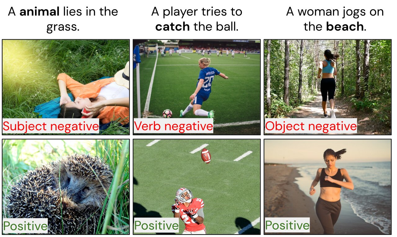 SVO-Probes includes 48,000 image-sentence pairs and tests understanding for more than 400 verbs. Each sentence can be broken into a <Subject, Verb, Object> triplet (or SVO triplet) and paired with positive and negative example images. The negative examples differ in only one way: the Subject, Verb, or Object is changed. The figure above shows negative examples in which the subject (left), verb (middle), or object (right) does not match the image. This task formulation makes it possible to isolate which parts of the sentence a model has the most trouble with. It also makes SVO-Probes more challenging than standard image retrieval tasks, where negative examples are often completely unrelated to the query sentence.