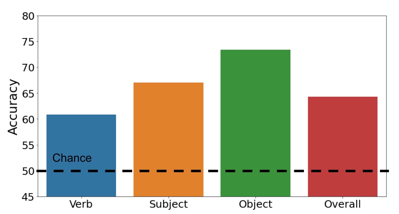We examine whether multimodal transformers can accurately classify examples as positive or negative. The bar chart below illustrates our results. Our dataset is challenging: our standard multimodal transformer model achieves 64.3% accuracy overall (chance is 50%). Whereas accuracy is 67.0% and 73.4% on subjects and objects respectively, performance falls to 60.8% on verbs. This result shows that verb recognition is indeed challenging for vision and language models.