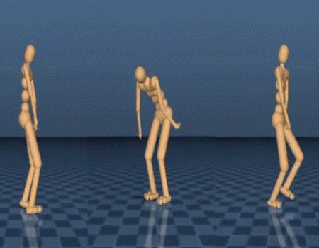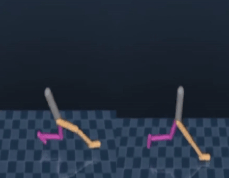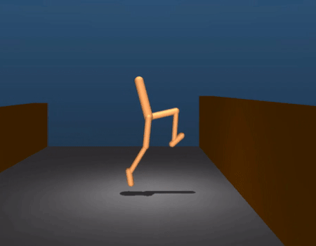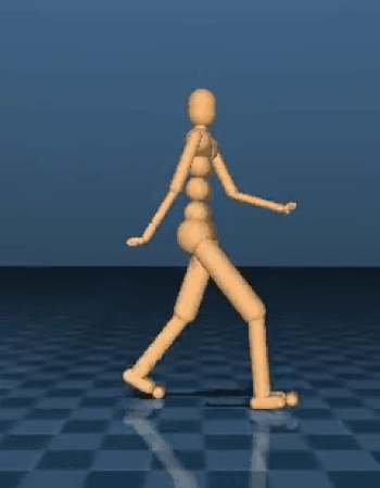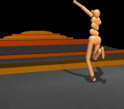The emergent behaviour described above can be very robust, but because the movements must emerge from scratch, they often do not look human-like. In our second paper, we demonstrate how to train a policy network that imitates motion capture data of human behaviours to pre-learn certain skills, such as walking, getting up from the ground, running, and turning. Having produced behaviour that looks human-like, we can tune and repurpose those behaviours to solve other tasks, like climbing stairs and navigating walled corridors.