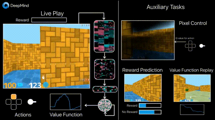 Our recent paper “Reinforcement Learning with Unsupervised Auxiliary Tasks” introduces a method for greatly improving the learning speed and final performance of agents. We do this by augmenting the standard deep reinforcement learning methods with two main additional tasks for our agents to perform during training.