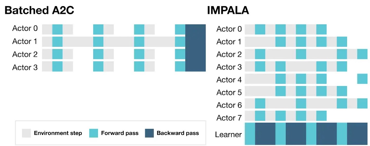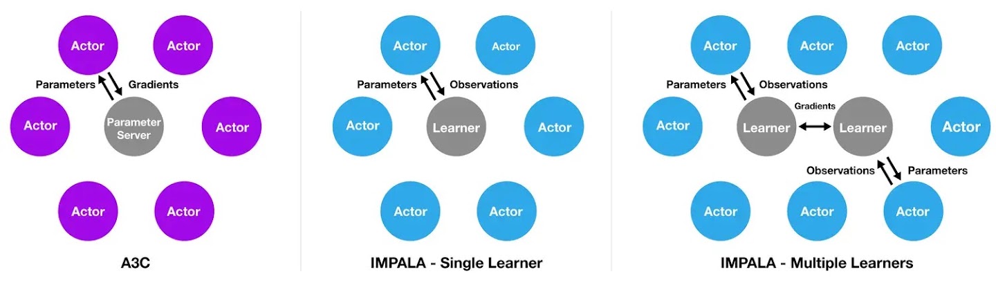Importance Weighted Actor-Learner Architecture is inspired by the popular A3C architecture which uses multiple distributed actors to learn the agent’s parameters. In models like this, each of the actors uses a clone of the policy parameters to act in the environment. Periodically, actors pause their exploration to share the gradients they have computed with a central parameter server that applies updates (see figure below).