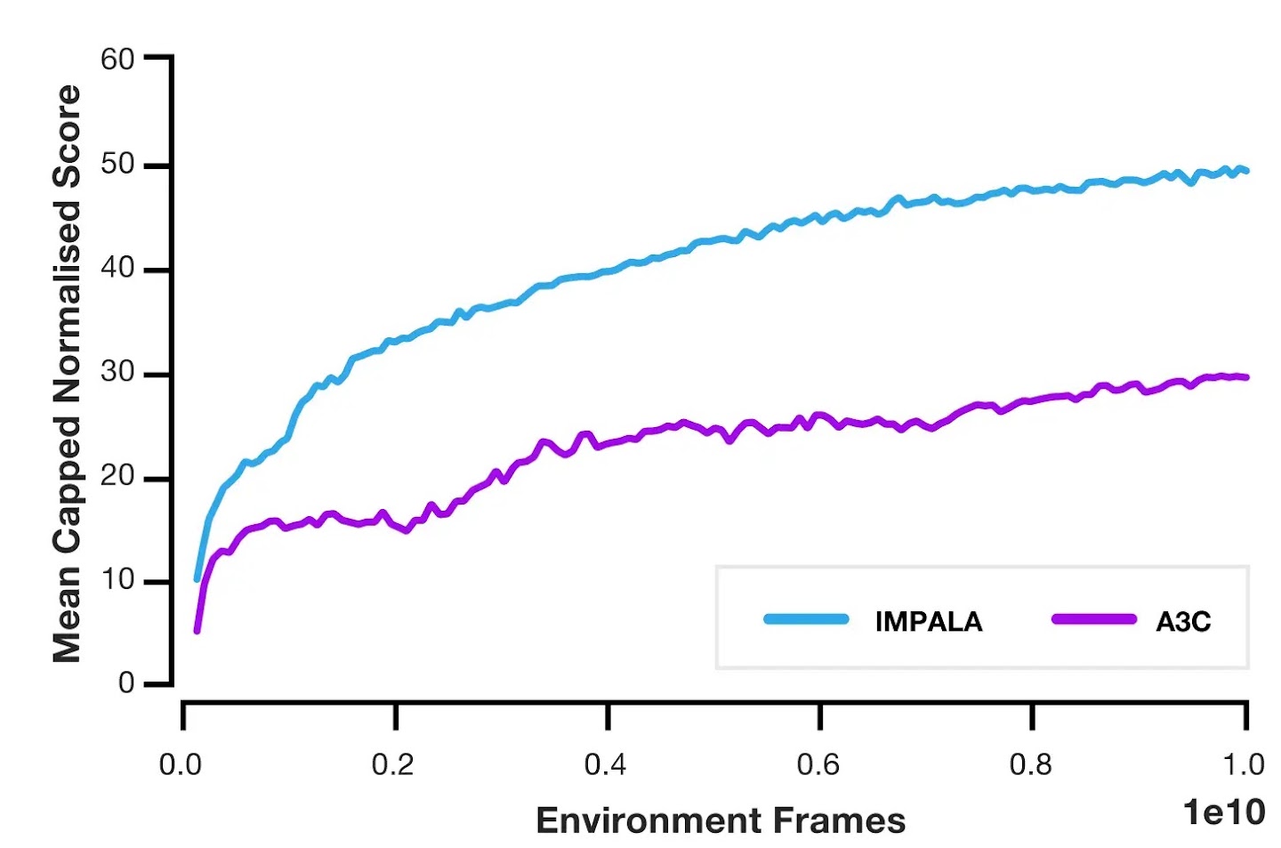 Importance Weighted Actor-Learner Architecture actors on the other hand are not used to calculate gradients. Instead, they are just used to collect experience which is passed to a central learner that computes gradients, resulting in a model that has completely independent actors and learners. To take advantage of the scale of modern computing systems, Importance Weighted Actor-Learner Architectures can be implemented using a single learner machine or multiple learners performing synchronous updates between themselves. Separating the learning and acting in this way also has the advantage of increasing the throughput of the whole system since the actors no longer need to wait for the learning step like in architectures such as batched A2C. This allows us to train Importance Weighted Actor-Learner Architectures on interesting environments without suffering from variance in frame rendering-time or time consuming task restarts.