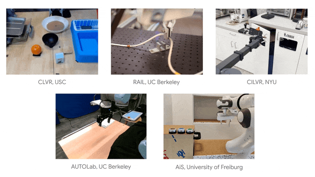 We would like to thank the co-authors of this work: Abhishek Padalkar, Acorn Pooley, Ajinkya Jain, Alex Bewley, Alex Herzog, Alex Irpan, Alexander Khazatsky, Anant Rai, Anikait Singh, Anthony Brohan, Antonin Raffin, Ayzaan Wahid, Ben Burgess-Limerick, Beomjoon Kim, Bernhard Schölkopf, Brian Ichter, Cewu Lu, Charles Xu, Chelsea Finn, Chenfeng Xu, Cheng Chi, Chenguang Huang, Christine Chan, Chuer Pan, Chuyuan Fu, Coline Devin, Danny Driess, Deepak Pathak, Dhruv Shah, Dieter Büchler, Dmitry Kalashnikov, Dorsa Sadigh, Edward Johns, Federico Ceola, Fei Xia, Freek Stulp, Gaoyue Zhou, Gaurav S. Sukhatme, Gautam Salhotra, Ge Yan, Giulio Schiavi, Hao Su, Hao-Shu Fang, Haochen Shi, Heni Ben Amor, Henrik I Christensen, Hiroki Furuta, Homer Walke, Hongjie Fang, Igor Mordatch, Ilija Radosavovic, Isabel Leal, Jacky Liang, Jaehyung Kim, Jan Schneider, Jasmine Hsu, Jeannette Bohg, Jeffrey Bingham, Jiajun Wu, Jialin Wu, Jianlan Luo, Jiayuan Gu, Jie Tan, Jihoon Oh, Jitendra Malik, Jonathan Tompson, Jonathan Yang, Joseph J. Lim, João Silvério, Junhyek Han, Kanishka Rao, Karl Pertsch, Karol Hausman, Keegan Go, Keerthana Gopalakrishnan, Ken Goldberg, Kendra Byrne, Kenneth Oslund, Kento Kawaharazuka, Kevin Zhang, Keyvan Majd, Krishan Rana, Krishnan Srinivasan, Lawrence Yunliang Chen, Lerrel Pinto, Liam Tan, Lionel Ott, Lisa Lee, Masayoshi Tomizuka, Maximilian Du, Michael Ahn, Mingtong Zhang, Mingyu Ding, Mohan Kumar Srirama, Mohit Sharma, Moo Jin Kim, Naoaki Kanazawa, Nicklas Hansen, Nicolas Heess, Nikhil J Joshi, Niko Suenderhauf, Norman Di Palo, Nur Muhammad Mahi Shafiullah, Oier Mees, Oliver Kroemer, Pannag R Sanketi, Paul Wohlhart, Peng Xu, Pierre Sermanet, Priya Sundaresan, Quan Vuong, Rafael Rafailov, Ran Tian, Ria Doshi, Roberto Martín-Martín, Russell Mendonca, Rutav Shah, Ryan Hoque, Ryan Julian, Samuel Bustamante, Sean Kirmani, Sergey Levine, Sherry Moore, Shikhar Bahl, Shivin Dass, Shuran Song, Sichun Xu, Siddhant Haldar, Simeon Adebola, Simon Guist, Soroush Nasiriany, Stefan Schaal, Stefan Welker, Stephen Tian, Sudeep Dasari, Suneel Belkhale, Takayuki Osa, Tatsuya Harada, Tatsuya Matsushima, Ted Xiao, Tianhe Yu, Tianli Ding, Todor Davchev, Tony Z. Zhao, Travis Armstrong, Trevor Darrell, Vidhi Jain, Vincent Vanhoucke, Wei Zhan, Wenxuan Zhou, Wolfram Burgard, Xi Chen, Xiaolong Wang, Xinghao Zhu, Xuanlin Li, Yao Lu, Yevgen Chebotar, Yifan Zhou, Yifeng Zhu, Ying Xu, Yixuan Wang, Yonatan Bisk, Yoonyoung Cho, Youngwoon Lee, Yuchen Cui, Yueh-hua Wu, Yujin Tang, Yuke Zhu, Yunzhu Li, Yusuke Iwasawa, Yutaka Matsuo, Zhuo Xu, Zichen Jeff Cui.