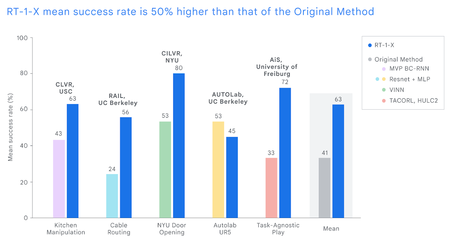 To evaluate RT-1-X in partner academic universities, we compared how it performed against models developed for their specific task, like opening a door, on corresponding dataset. RT-1-X trained with the Open X-Embodiment dataset outperformed the original model by 50% on average.
