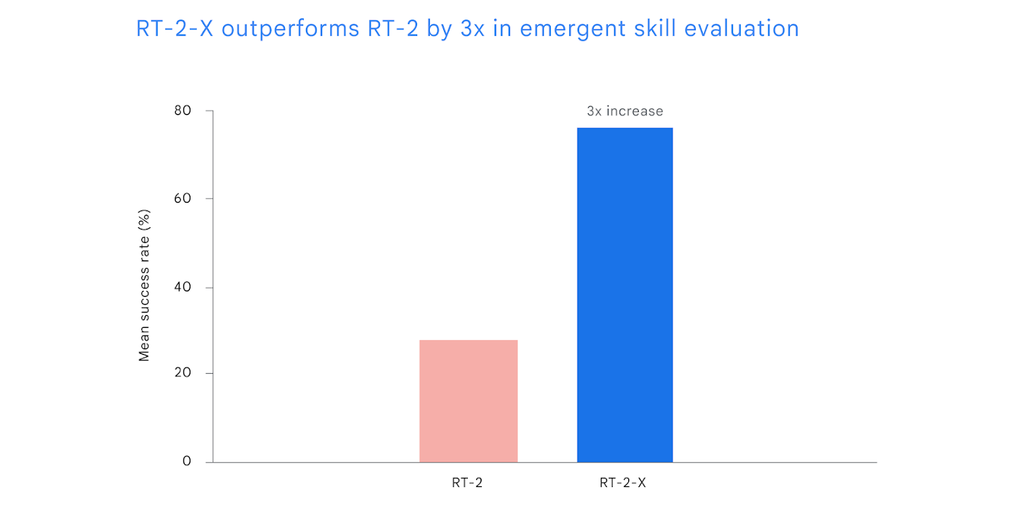 To investigate the transfer of knowledge across robots, we conduct experiments with our helper robot on tasks that involve objects and skills that are not present in the RT-2 dataset but exist in another dataset for a different robot. Specifically, RT-2-X was three times as successful as our previous best model, RT-2, for emergent skills.