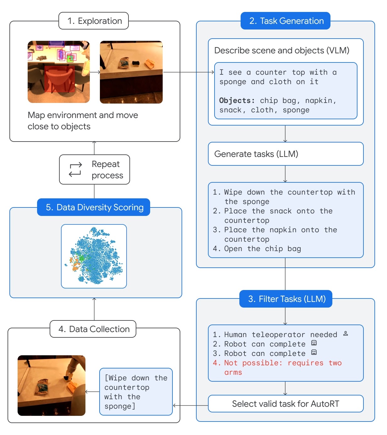 (1) An autonomous wheeled robot finds a location with multiple objects. (2) A VLM describes the scene and objects to an LLM. (3) An LLM suggests diverse manipulation tasks for the robot and decides which tasks the robot could do unassisted, which would require remote control by a human, and which are impossible, before making a choice. (4) The chosen task is attempted, the experiential data collected, and the data scored for its diversity/novelty. Repeat.