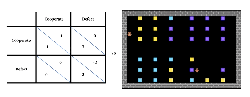 Like other agent-based modeling approaches, multi-agent deep reinforcement learning makes it easy to specify models that cross levels of analysis that would be hard to treat with game theory. For instance, actions may be far closer to low-level motor primitives (e.g. 'walk forward'; 'turn right') than the high-level strategic decisions of game theory (e.g. ‘cooperate’). This is an important feature needed to capture situations where agents must practice to learn effectively how to implement their strategic choices. For instance in one study, agents learned to cooperate by taking turns cleaning a river. This solution was only possible because the environment had spatial and temporal dimensions in which agents have great freedom in how they structure their behavior towards one another. Interestingly, while the environment allowed for many different solutions (such as territoriality), agents converged on the same turn-taking solution as human players.
