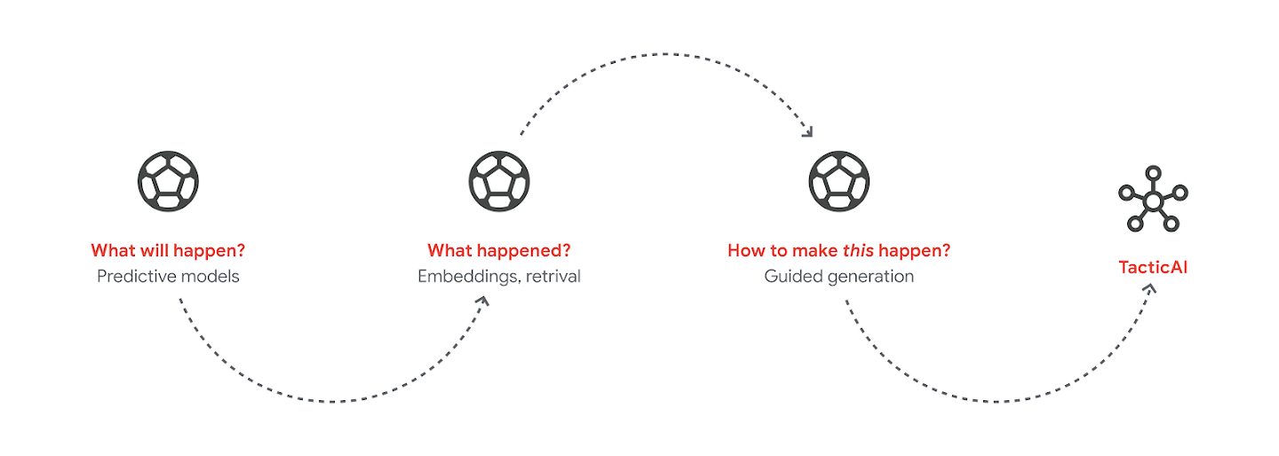 TacticAI is a full AI system with combined predictive and generative models to analyze what happened in previous plays and how to to make adjustments towards making a particular outcome more likely.