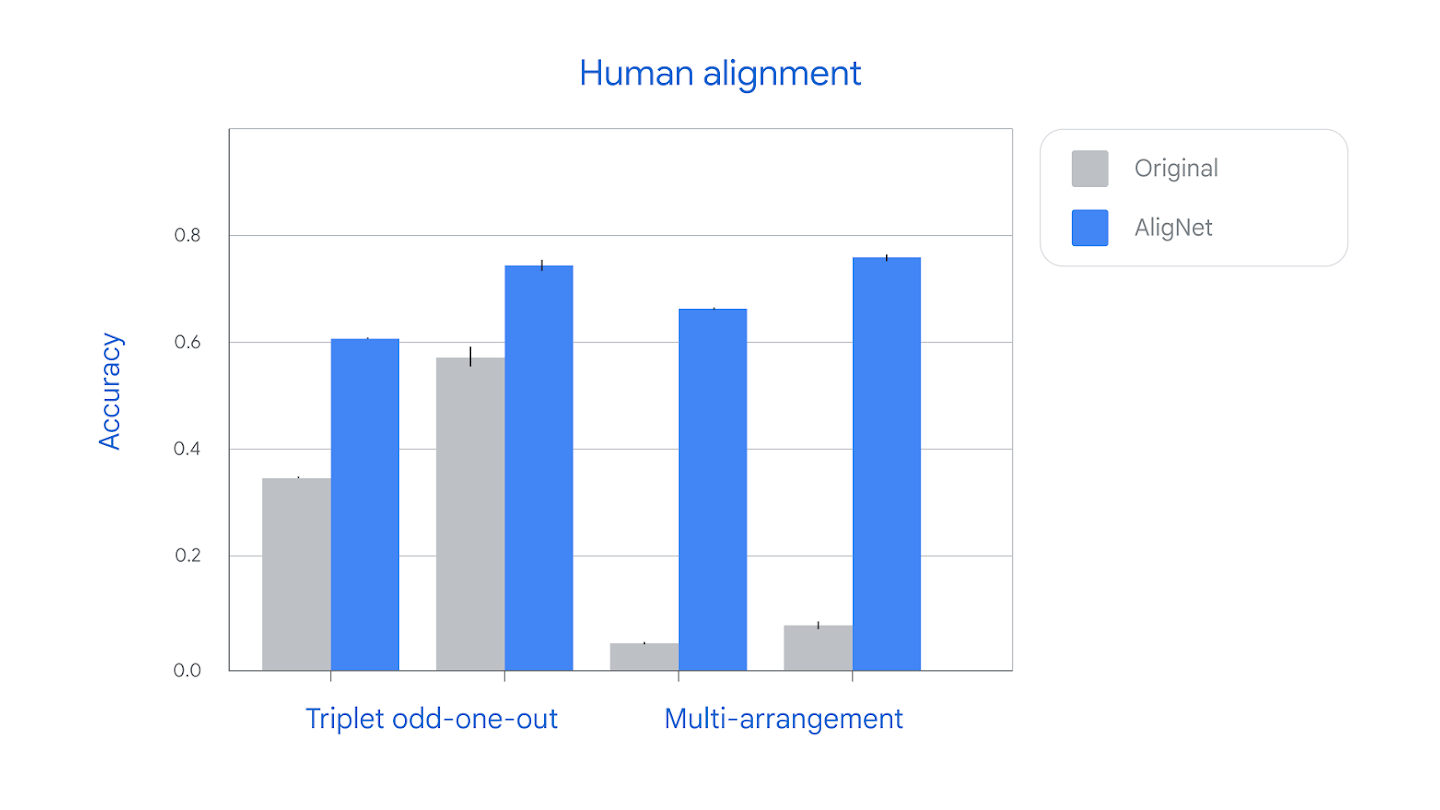 To better understand these differences, today we’re publishing a new paper in Nature analyzing the important ways AI systems organize the visual world differently from humans. We present a method for better aligning these systems with human knowledge, and show that addressing these discrepancies improves their robustness and ability to generalize.
