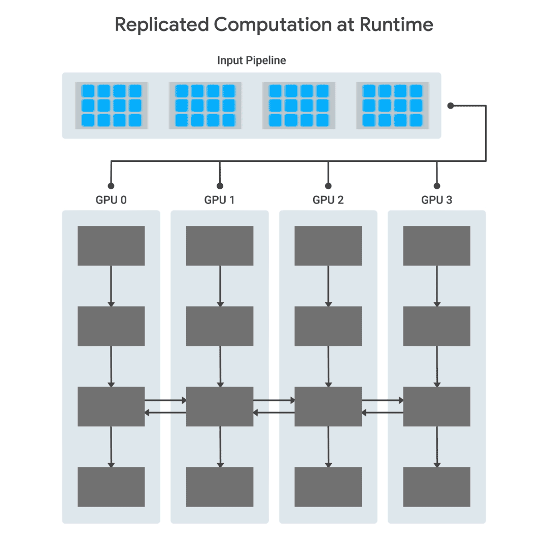 At DeepMind, the Research Platform Team builds infrastructure to empower and accelerate our AI research. Today, we are excited to share how we developed TF-Replicator, a software library that helps researchers deploy their TensorFlow models on GPUs and Cloud TPUs with minimal effort and no previous experience with distributed systems. TF-Replicator’s programming model has now been open sourced as part of TensorFlow’s tf.distribute.Strategy. This blog post gives an overview of the ideas and technical challenges underlying TF-Replicator. For a more comprehensive description, please read our arXiv paper.