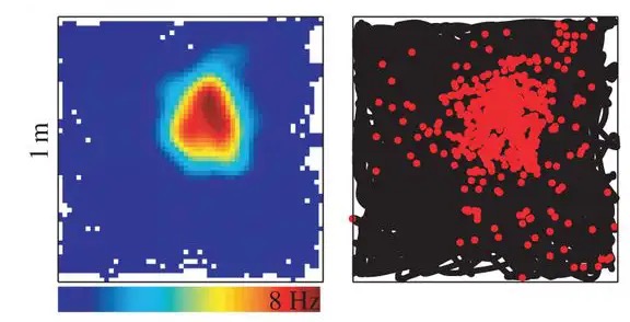 The activity of a single place cell recorded from the hippocampus of a rat as it explores a square room. On the left, the average activity or “firing rate” of the neuron is shown at each location in space. On the right, the black lines denote the places the rat visited, and the red dots mark the animal’s position each time a cell become active, or “fired.” As is typical of a place cell, this cell tends to fire only when near its preferred location in the upper right corner of the room. Credit: Royal Society (2013)