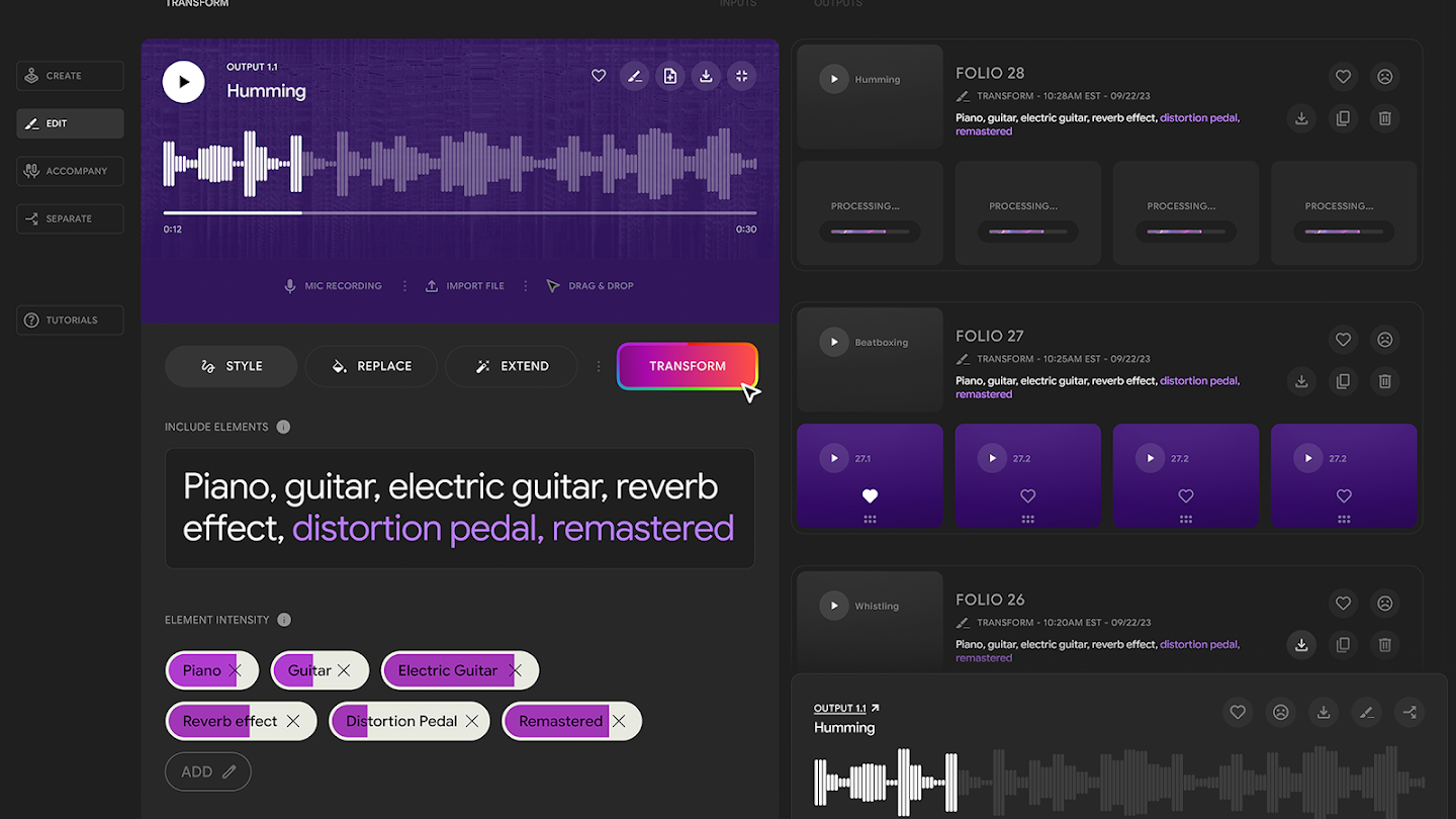 Imagine singing a melody to create a horn line, transforming chords from a MIDI keyboard into a realistic vocal choir, or adding an instrumental accompaniment to a vocal track.
