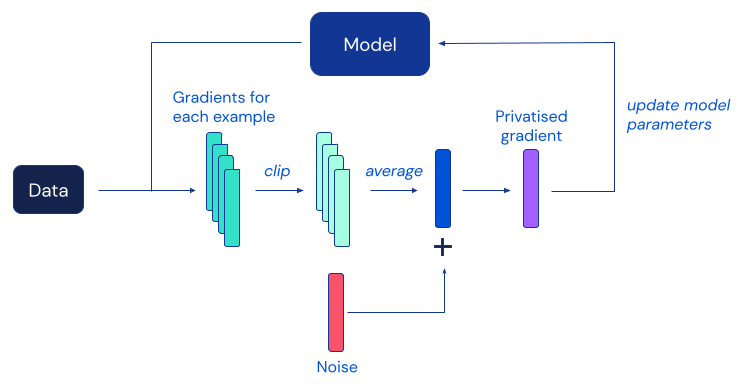 Figure 2: Illustration of how DP-SGD processes gradients of individual examples and adds noise to produce model updates with privatised gradients.