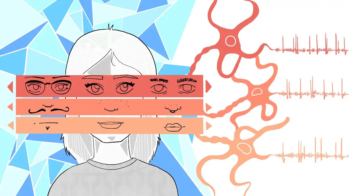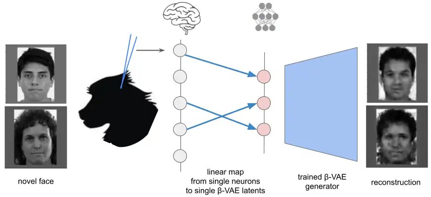 Figure 2. Single neurons in the primate face patches at the end of the visual processing hierarchy represent interpretable face attributes, like eye shape or the presence of a smile, and are equivalent to single artificial neurons in β-VAE discovered through disentangled representation learning. Image credit Marta Garnelo.