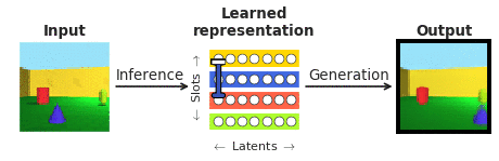 Figure 1. Disentangling refers to the ability of neural networks to discover semantically meaningful attributes of images without being explicitly taught what these attributes are. These models learn by mapping images into a lower-dimensional representation through an inference neural network, and trying to reconstruct the image using a generation neural network. Each individual latent unit in a disentangled representation learns to encode a single interpretable attribute, like colour or size of an object. Manipulating such latents one at a time results in interpretable changes in the generated image reconstruction. Animation credit Chris Burgess.