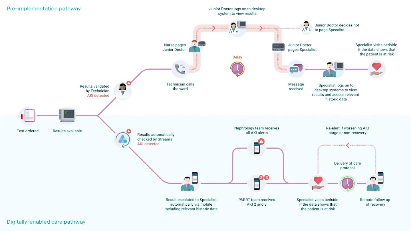 By using Streams, specialists reviewed urgent cases within 15 minutes or less(a process that might otherwise have taken several hours) and fewer cases of AKI were missed (3.3% rather than 12.4%). The app also reduced the average cost of admission for a patient with AKI by 17%, demonstrating a huge potential cost saving for hospitals in the future, considering that AKI costs the NHS more than £1 billion each year.
