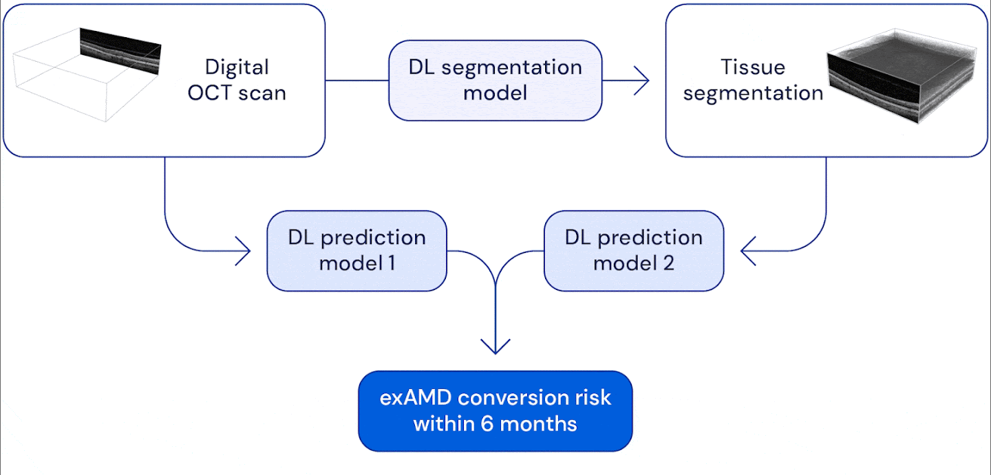 Figure 1: AI system for predicting exAMD. Predictions from the raw and segmented retina scans are combined to calculate the risk of AMD progression within 6 months.