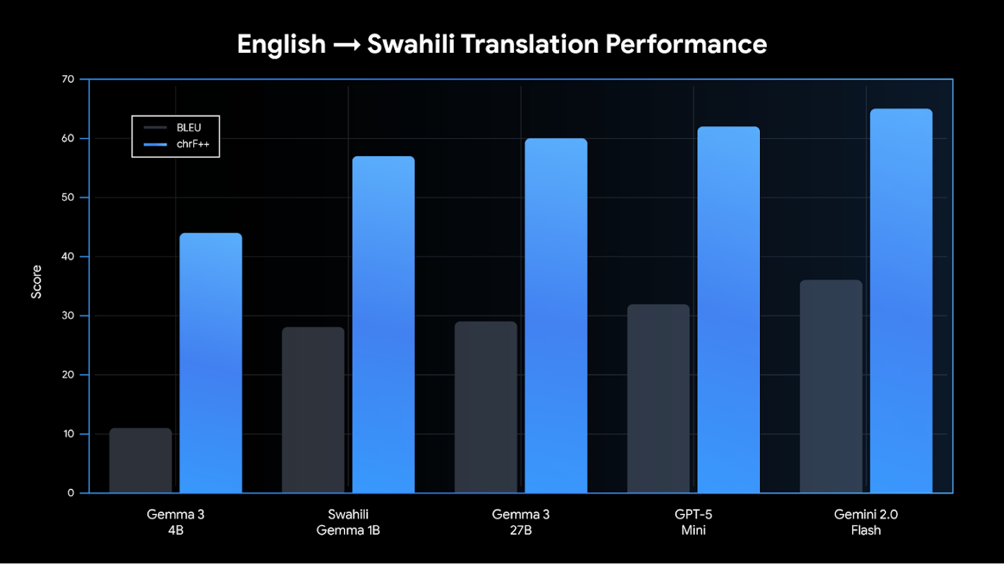 To succeed, the Crane AI Labs team required a model that could function quickly and accurately on low-power, offline devices. After rigorous testing, they found Gemma 3 1B offered the best translation accuracy in Swahili relative to its small size.