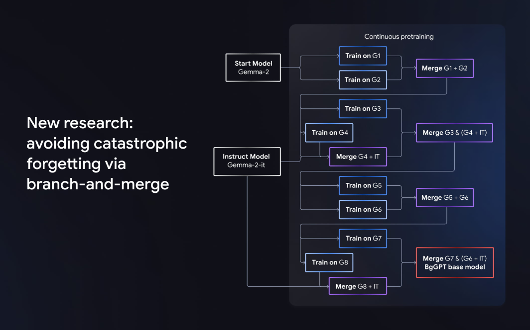 BgGPT was pre-trained on around 85B Bulgarian tokens and 15B in English. One of the more unique elements of BgGPT’s development was the use of INSAIT’s own Branch-and-Merge continual pre-training strategy, which enables the model to learn new information like Bulgarian without replacing or losing old information, like Gemma’s deep understanding of mathematics and English. This phenomenon is referred to as “catastrophic forgetting” and remains a recurring challenge in LLM development.