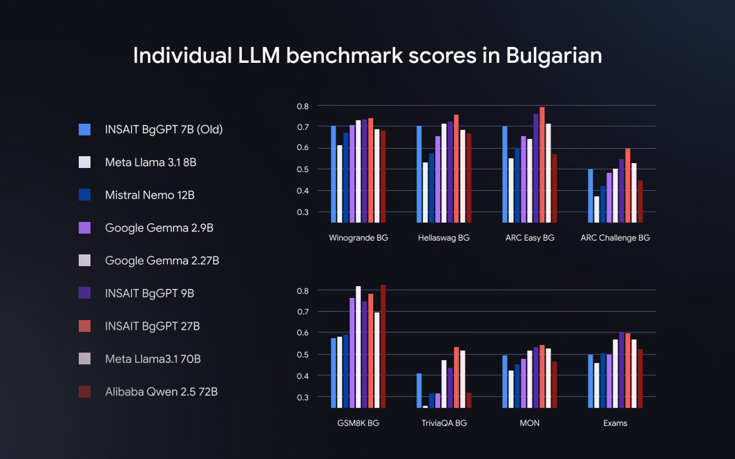 INSAIT researchers created BgGPT to cover a wide range of needs for Bulgarian-speaking developers and users. The model comes in 27B, 9B, and 2B parameter sizes. Both the 27B and 9B variants outpace larger models like Alibaba’s Qwen 2.5 72B and Meta’s Llama 3.1 70B in Bulgarian. Meanwhile, the 2B version outperforms other small language models like Microsoft’s Phi 3.5 and Alibaba’s Qwen 2.5 3B. All three models maintain competitive English performance, thanks to Gemma 2’s impressive linguistic capabilities.